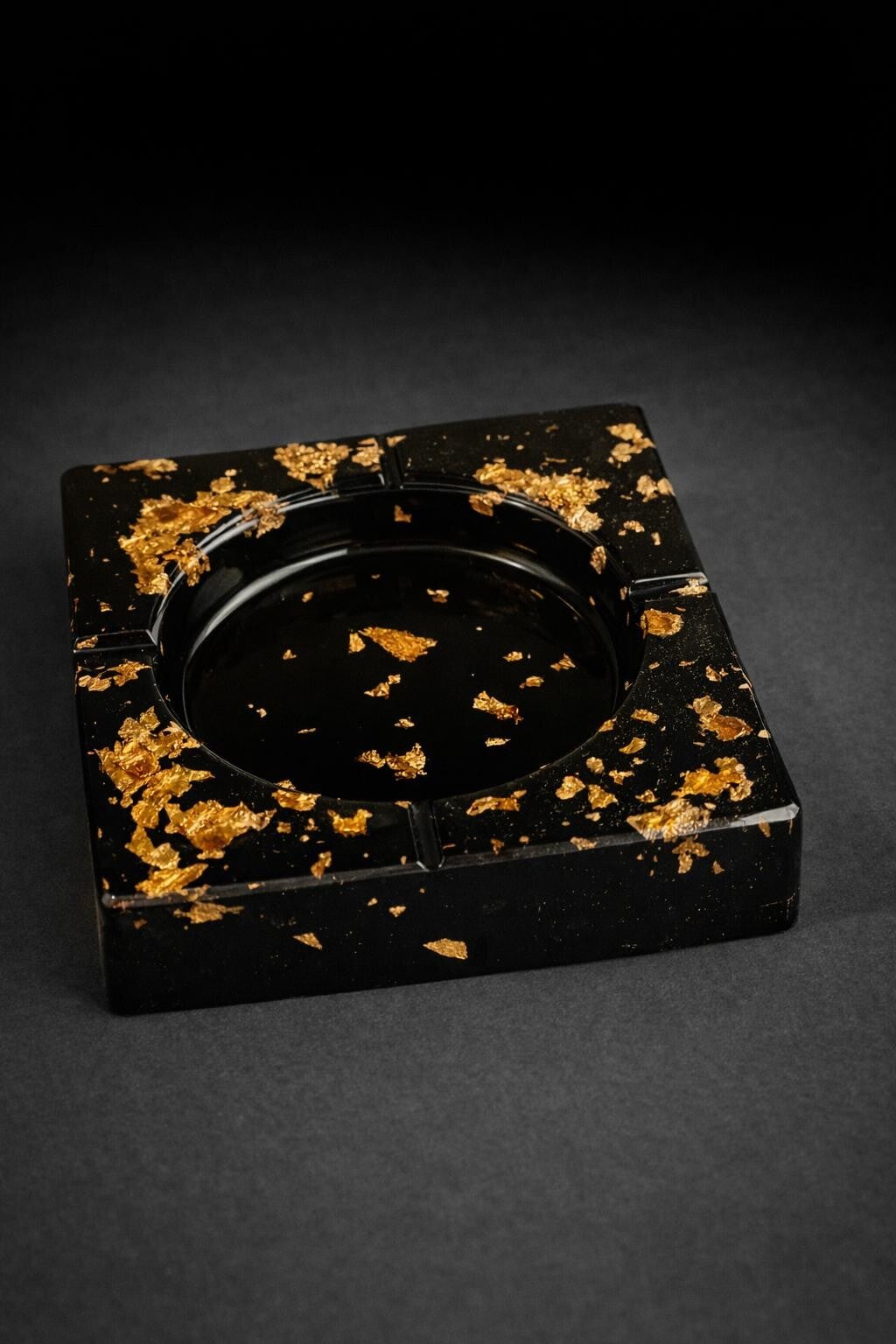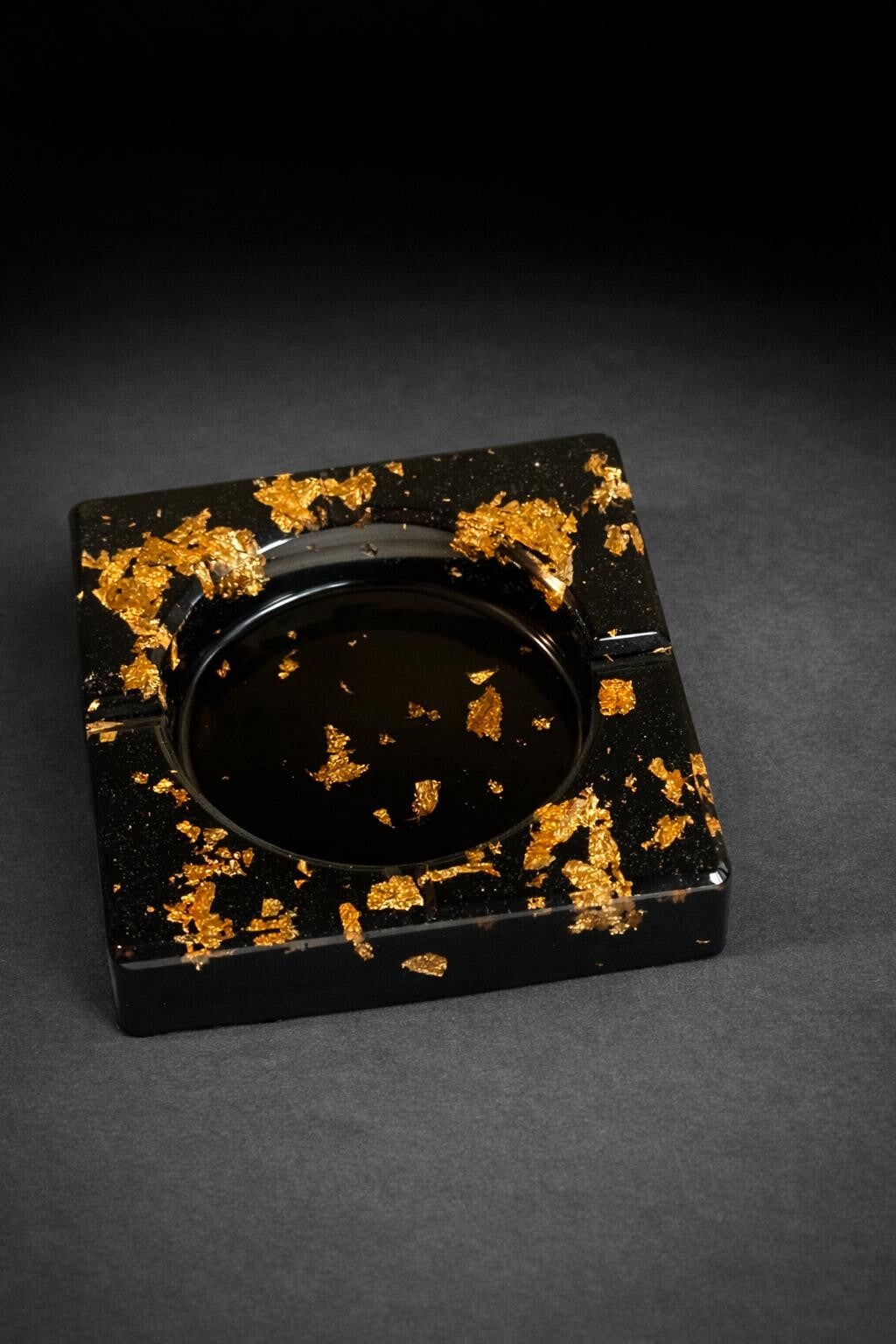 This stylish ashtray is handcrafted from premium black epoxy resin and decorated with elegant gold flakes, creating a modern and luxurious design.